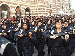 The People's Volunteer Corps (Malay: Jabatan Sukarelawan Malaysia), abbreviated RELA, officially the Malaysia Volunteers Corps Department, is a paramilitary civil volunteer corps formed by the Malaysian government. Their main duty is to check the travelling documents and immigration permits of foreigners in Malaysian cities, including tourists, visitors and migrants to reduce the increasing rate of illegal immigrants in Malaysia. RELA has the authority to deal with situations like policemen, such as raiding suspected streets or places such as factories, restaurants and even hotels.
