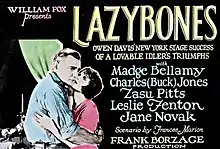 Lazybones is a 1925 American silent romantic drama film produced and directed by Frank Borzage and starring Madge Bellamy, Buck Jones, and Zasu Pitts. It opened in New York City on September 22, 1924, and received wider distribution by Fox Film Corporation during 1925.[1][2]