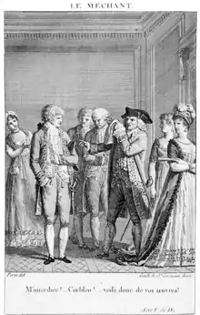 Several lines in Les Liaisons dangereuses refer or allude to Le Méchant: Madame de Merteuil quotes Cléon's "Les sots sont ici-bas pour nos menus plaisirs" (II.I) in letter 63, citing the play, and Valmont alludes to the same character's "Ma foi, quand je parcours tout ce qui le compose [le monde]/Je ne trouve que nous qui valions quelque chose" (II.III) in letter 100, when he says "En vérité, plus je vais, et plus je suis tenté de croire qu'il n'y a que vous et moi dans le monde, qui valions quelque chose."[7] In 1792, Elizabeth Inchbald adapted the play into the farce Young Men and Old Women.[8]