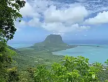 Le Morne Brabant [lə mɔʁn bʁa.bɑ̃] is a peninsula at the extreme southwestern tip of the Indian Ocean island of Mauritius on the western side of the island. It is highlighted by an eponymous basaltic monolith with a summit 556 metres (1,824 ft) above sea level. The summit covers an area of over 12 hectares (30 acres). There are many caves and overhangs on the steep slopes. It is largely surrounded by a lagoon and is a well known tourist attraction. It is also a refuge for two rare plants, the Mandrinette and the Boucle d'Oreille. The peninsula of Le Morne benefits from a micro-climate. The mountain is named after the VOC-ship (Dutch East India Company) Brabant that ran aground there on 29 December 1783 on the cliffs.