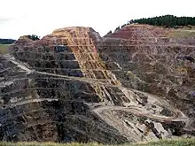 Two prominent manmade features of Lead's geography are the giant open cut, which was used for surface gold mining by the Homestake Mine,[15] and the resulting ridge nearby built with the non-producing material from the cut.