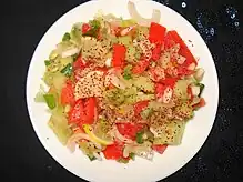 Cheese, as well as yogurt and eggs, are used in the cuisine of Lebanon. One of the more recognizable dishes within Lebanon is labneh. Unlike regular yogurt, labneh is strained so as to remove the watery whey, leaving a thicker, creamier consistency. It is spreadable and garnished with olive oil and sea salt.[44] It is an extremely versatile dish that can be served in a mezze platter for either breakfast or dinner. A variant is mixed with garlic.[44] Ejjeh is the traditional omelette of Lebanon.[45] It is made with egg, chopped parsley and scallions. Within Lebanon, people make this omelette with different herbs that are cultivated from their village.[46][47]
