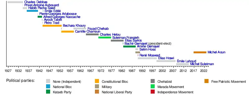 31 October 2016 | 31 October 2022 | 6 years | Free Patriotic Movement | Aoun was the commander of the Lebanese Armed Forces (1984–1989), held a disputed military presidency and premiership (1988–1990) and leader of the Free Patriotic Movement. From the expiration of the term of President Michel Suleiman in May 2014 until October 31, 2016, the parliament was unable to obtain the majority required to elect a president, and the office was vacant for almost two and a half years, despite more than 30 votes being held. On October 31, 2016, the parliament finally elected Michel Aoun as president after an agreement was signed between the leader of the Free Patriotic Movement Gebran Bassil, and the leader of the Lebanese Forces Samir Geagea[14] at the latter's headquarters in Maarab, which requires Geagea, who had withdrawn from the presidential race, to endorse Michel Aoun's candidacy for the 2016 presidential elections, years after a long rivalry that goes back to the Lebanese Civil War. | |