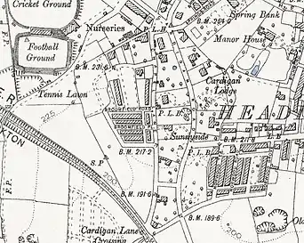 The landowner, Henry Cowper Marshall, returned to the previous plan of developing houses across the site. It was divided into building plots and sold off, with Cardigan Road, which runs from Burley Road to Kirkstall Lane, being driven through the centre of the former zoo in 1868; it was wider and faster than the old Chapel Lane. Villas with large gardens were erected on either side in what was known as the "Old Gardens Estate",[10] resisting the dense back-to-back type of development further down in Hyde Park during this era, with high-quality mansions in every plot by 1893.[11] Several notable local architects designed the villas, including Thomas Ambler, Charles Fowler, George Corson, Edward Birchall, and F W Bedford, making it a rather exclusive development with bespoke houses for prosperous clients. Several have subsequently been demolished and replaced with 1970s apartment buildings.[12]