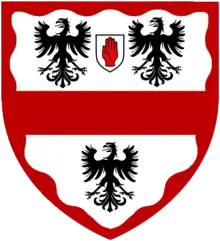Arms of Leeds: Argent, a fess gules between three eagles displayed sable a bordure wavy of the second, here with an inescutcheon of a baronet, a Red Hand of Ulster; crest: A Staff raguly fessways vert thereon a cock gules wings expanded combed wattled beaked and legged or the whole debruised by a bendlet sinister ermine; motto: Vigilate (Watch ye!)[1]