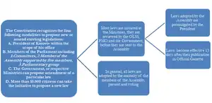 The Republic of Kosovo is a democracy working under the Rule of Law, respect for its Constitution and laws, and the recognition of international law. The production of laws has grown considerably, and basic laws essential to the operation of the justice system have been adopted. As provided in the Law on Legislative Initiatives, laws in Kosovo are initiated either by the President,[4] the Government,[5] members of the Assembly[6] or initiatives of 10, 000 citizens.[7] The vast majority of laws originate with the Executive Branch of the Government, where Ministries are responsible for proposing legislation as well as overseeing drafts and amendments of primary and secondary laws. Members of the Assembly can propose amendments to legislation by submitting a motion to the Assembly Table and the government for its opinion. Ministry drafts are sent to the Office of Legal Support Services (OLSS) within the Prime Ministers Office (PMO). The laws undergo a second tier of review at the Government level, from the OLSS, Ministry of Finance (MoF) and Agency for European Integration (AEI). After their review and approval the law is sent to the Coordinating Group of the Government and finally proceeds to the Assembly for review and adoption.
