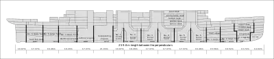 The Titanic was designed to comply with the Grade 1 subdivision proposed by the 1891 Bulkhead Committee, meaning that it could stay afloat with any two adjoining out of its 16 main compartments open to the sea. The height of the bulkhead deck above the water line in flooded condition was well above the requirements, and the vessel would have been able to float with 3 adjoining compartments flooded in 11 of 14 possible combinations.[6] The subdivisions could be sealed from communication with each other with cast iron watertight doors. To somewhat lower the chance of a sailor being caught in them, a geared system dropped the doors gradually, over 25 to 30 seconds, by sliding them vertically on hydraulic cataract cylinders.[7]