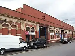The southern end of the new station and its viaduct required building over Jewry Wall Street and some of the houses that stood on it. In 1832 at one of these houses, number 53, a well-preserved and high-quality Roman mosaic floor was uncovered during enlargement of the cellar. The floor was preserved and the owner allowed public access to view the mosaic on request. Although number 53 was demolished the Great Central undertook to preserve the Roman floor within the structure of the southern northbound platform that was built around it. The mosaic was encased in a brick vault topped by a glass ceiling let into the platform so it could be viewed from above. A locked doorway at street level provided access to the vault and a local shopkeeper was entrusted with the key to continue to provide access to the public upon request.[4] The main station entrance was on Great Central Street where a large ornate terracotta-lined archway crowned by an ornate clocktower led through to the entrance hall and cab waiting area; the station frontage itself had a red brick and terracotta facade, to the left of which was the entrance to the parcels office. A second entrance was in Jarvis Street where a subway 20 ft below the platforms led through to the main booking hall, a light and airy space topped by a glazed roof. Stairs led up to the platforms, whilst a hydraulic lift was used to transport luggage from the booking hall.[5]