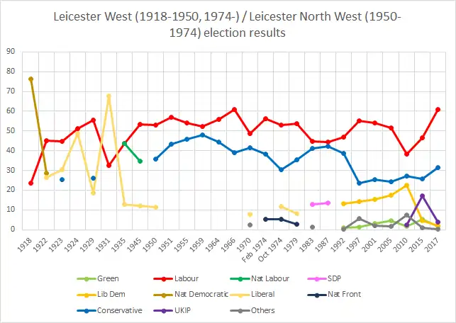 Historically this used to be the safest Labour seat in Leicester—in the 1983 general election it was the only one to remain in Labour hands. However, the high Asian populations in Leicester South and Leicester East have pushed them away from the Conservative Party; while Leicester West is still a safe Labour seat, represented by that party since the Second World War, it is the most marginal of the three Leicester seats.[3] While it did, like the other two Leicester seats, see a significant swing to Labour in 2017, unlike the other two seats Liz Kendall's majority was not a record high for the constituency.