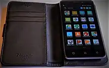 The Lenovo Vibe Z is a high-end Android smartphone that accepts dual SIMs. It is 7.99 mm thick and has 5.5-inch display.[51] The Vibe Z uses a relatively large 1/3.06-inch backlit camera sensor paired with a f/1.8 lens and a dual-LED flash in order to achieve good low-light performance. The front-facing camera has a wide-angle lens with an 84-degree field of view.[52]