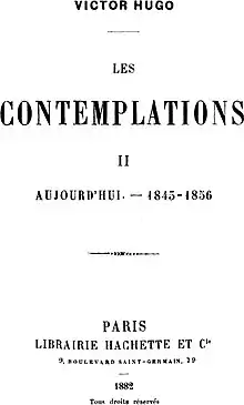 Les Contemplations (The Contemplations) is a song and collection of poetry by Victor Hugo, published in 1856. It consists of 156 poems in six books. Most of the poems were written between 1841 and 1855, though the oldest date from 1830. Memory plays an important role in the collection, as Hugo was experimenting with the genre of autobiography in verse. The collection is equally an homage to his daughter Léopoldine Hugo, who drowned in the Seine in 1843.