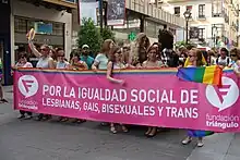 The first lesbian organization, Grup de Lluita per l'Alliberament de la Dona, in Spain would not be founded until 1979 in Barcelona.[61][62][63] Despite this, lesbians would continue to maintain a lower profile in the LGBTQ+ community in Spain than their gay male peers.[62][63] When not maintaining a lower profile, they were actively ignored by their male peers as completely unimportant.[63]