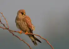 The lesser kestrel (Falco naumanni) is a small falcon. This species breeds from the Mediterranean[2] across Afghanistan and Central Asia, to China and Mongolia. It is a summer migrant, wintering in Africa and Pakistan and sometimes even to India and Iraq. It is rare north of its breeding range, and declining in its European range. The genus name derives from Late Latin falx, falcis, a sickle, referencing the claws of the bird,[3] and the species name commemorates the German naturalist Johann Friedrich Naumann.[4]