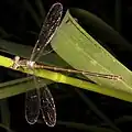 Lestes is a genus of damselfly in the family Lestidae.[2] The family hold their wings at about 45 degrees to the body when resting. This distinguishes them from most other species of damselflies which hold the wings along, and parallel to, the body when at rest.