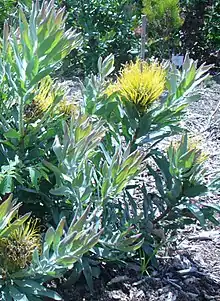 Leucospermum formosum is a large upright shrub of up to 3 m (9.8 ft) high, from the family Proteaceae. It grows from a single trunk and its branches are greyish felty. The softly felty leaves are lance-shaped to elliptic, 6+12–10 cm (2.6–3.9 in) long and 14–20 mm (0.55–0.79 in) wide. The flower heads are flattened and about 15 cm (5.9 in) across, and consist of bright yellow flowers from which long, styles emerge which are strongly clockwise bent just below the white, later pink thickened tip. From above, the heads look like turning wheels. It is called silver-leaf wheel-pincushion in English. It flowers during September and October. It is an endemic species of the Western Cape province of South Africa.[3][4]