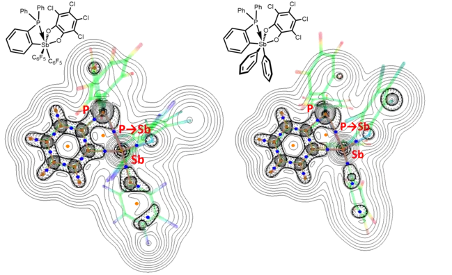 Contour plots of the Laplacian of the electron density of (left) (o-C6H4(PPh2)[Sb(C6F5)2(O2C6Cl4)] and (right) o-C6H4(PPh2)[(SbPh2(O2C6Cl4)]. Blue dots are the bcp and brown lines are the bond paths.[17]