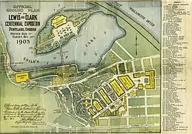 After gaining the necessary financial backing (and the Commission that came with it), the Board of Directors then began the process of choosing a site on which to hold this fair. There were a number of locations considered, on both the east and west sides of the Willamette River. The three main sites on the eastern side were University Park, now the site of the University of Portland; City View Park, now Sellwood Park and Oaks Park; and Hawthorne Park, now an industrial area. The western sites considered were City Park, now Washington Park; and Guild's Lake in the Balch Creek watershed.[25] Guild's Lake was a site "everyone in Portland was vaguely aware of ... [though] no one on the site selection subcommittee could remember whether it evaporated during the dry season."[25] Inspections showed it remained at a depth of 2.5 feet (0.76 m) through the summer, and therefore would be an appropriate site. By September 4, 1902, the Oregon Journal reported: "the fair officials are hot on the trail of a site and it is confidently predicted that 'something will be doing' shortly."[26] The next day, they reported the committee narrowed its choices to "two tracts ... Willamette heights on the west side and Hawthorne Park, with a portion of the Ladd tract, on the east side," and that Willamette Heights was to be chosen, as "It is claimed that the natural advantages offered by the Willamette Heights outweigh all other considerations and that ... Guild's Lake, it is said, can be utilized to great advantage and made a scene of beauty."[27] With this voting, "the Lewis and Clark Exposition had its site – a grove of trees, 180 acres (0.73 km2) of pasture, and 220 acres (0.89 km2) of waist-high stagnant water at the site's center."[28]