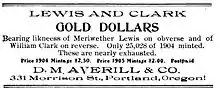 Funds from the sale of the coin were designated for the completion of a statue to Sacagawea in a Portland park.[16] There was little mention of the dollar in the numismatic press. Q. David Bowers speculates that Dr. George F. Heath, editor of The Numismatist, who opposed such commemoratives, declined to run any press releases Zerbe might have sent.[17] Nevertheless, an article appeared in the August 1905 issue, promoting the exhibit and dollar. As it quotes Zerbe and praises his efforts, it was likely written by him.[20] Zerbe concentrated on bulk sales to dealers, as well as casual ones at the fair at a price of $2; he enlisted Portland coin dealer D.M. Averill & Company to make retail sales by mail. There were also some banks and other businesses that sold coins directly to the public. Averill ran advertisements in the numismatic press, and in early 1905, raised prices on the 1904 pieces, claiming that they were near exhaustion. This was a lie: in fact, the 1904-dated coins sold so badly that some 15,000 were melted at the San Francisco Mint.[17] Zerbe had Averill sell the 1905 issue at a discounted price of ten dollars for six pieces.[15] As he had for the Louisiana Purchase dollar, Zerbe made the coins available mounted in spoons or in jewelry. Little else is known regarding the distribution of the gold dollars.[17]
