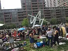 A pedestrian bridge to connect Liberty Village to neighbouring Niagara was approved in 2011 and construction began in 2018.[10] The $11.5 million bridge will provide better access to both Liberty Village and Niagara which is currently cut off by the railway corridor with access to King Street either by travelling west to Dufferin Street or east to Strachan Avenue to travel north to King Street West. Both areas were once industrial lands but are now primarily residential. The steel truss span will be added in September 2019 and should open in 2020.[11]