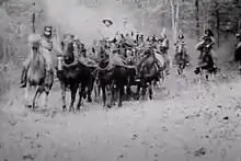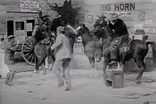 The party, having finished their visit, re-enters the stagecoach and rides away. One of the bad guys sees them leave, then rounds up some Indians to chase the stagecoach. They catch up to the stagecoach and capture a pretty girl passenger. The stage driver escapes and goes to find the good guy. When the good guy finds out what happened, he rounds up a posse and goes off to save the girl. The posse gives chase to the Indians, killing several in the process, and the girl is rescued. The last scene shows the good guy and the girl sitting arm-in-arm. The bad guy sneaks up on him and tries to kill him, but the Indian girl from the first scene shoots the bad guy first, then kneels down at the feet of the good guy, presumably in gratitude for him saving her from the bad guy at the beginning.[1]