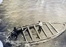 The lifeboat was launched without its plug, causing water to leak into the bottom of the boat. As Gibson later put it, "this was remedied by volunteer contributions from the lingerie of the women and the garments of men."[33] Those aboard had to sit for hours with their feet soaking in ice-cold water.[34] When Titanic went down at 2:20 A.M., the noise of hundreds of people screaming for help was heard by the lifeboat's occupants, a sound that Gibson said would "remain in my memory until the day I die." George Hogg, a Titanic lookout manning the boat, wanted to turn back to pick up some of those in the water but was shouted down by the boat's occupants.[35] They drifted for some time until they came within reach of Lifeboat 5. The officer in charge of the latter decided to transfer a number of survivors from his boat, which he thought was overcrowded, into Lifeboat 7.[36] The two boats were lashed together for the rest of the night until they separated to meet the RMS Carpathia.[37]