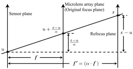 In order to focus on some other plane besides the front focal plane of the objective, say, the plane whose conjugated plane is away from the sensor plane, the conjugated plane can be moved from to and reparameterize its light field back to the original one at :
