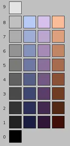 Three hues in the Munsell color model. Each color differs in value from top to bottom in equal perception steps. The right column undergoes a dramatic change in perceived color.