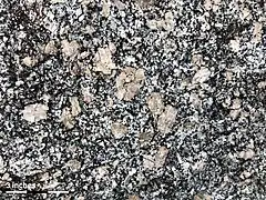 The Lilesville Granite is composed of megacrysts up to 4 cm of pink potassium-rich feldspar surrounded by gray plagioclase feldspar, clear quartz, and biotite. Small amounts of muscovite and magnetite are also present. The texture of the rock ranges from medium-grained (~4-5 mm) to large, coarse grains (~4 cm).[3][4]