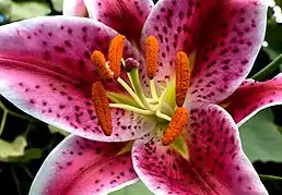 Lilium 'Stargazer' (the 'Stargazer lily') is a hybrid lily of the 'Oriental group'. Oriental lilies are known for their fragrant perfume, blooming mid-to-late summer. Stargazers are easy to grow and do best in full sunlight.[1] They have a fast growth rate and should be planted in full sun in well-drained loamy or sandy soil. When mature, 'Stargazers' can grow to a height of 36 inches with a spread of 10 to 14 inches with 2 to 8 flowers per stem.[2]