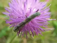 The larva is rather variable but is usually green or yellow, often with red markings. It feeds on the flowers of a variety of plants (see list below). The species overwinters as a pupa.