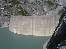 Below Lake Mutt, the main reservoir in the complex is Lake Limmern (Limmernsee), which was created by a 146 m (479 ft) tall and 375 m (1,230 ft) long arch dam on the Limmern Creek. At an elevation of 1,857 m (6,093 ft) above sea level, it can store up to 92,000,000 m3 (75,000 acre⋅ft) of water.[2]