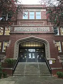 The school was built in 1906 in the Wallingford neighborhood to handle the growth in the area.[2] It opened in 1907 and until 1971 was a three-year senior high school (grades 10-11-12, or sophomores/juniors/seniors), thereafter a four-year high school with grades 9 to 12. Lincoln High closed as a school in its own right after 74 years in 1981, and the building has been used several times since as a temporary holding location for other Seattle public schools as their own buildings underwent renovations / remodelings / rebuildings.[1][3] The Lincoln building housed Ballard High School in 1997–1999 while their current facility was being built, then the Latona Elementary School (1999–2000).[1] It next housed Roosevelt High School in 2004–2006 and Garfield High School in 2006–2008 while their respective buildings were being renovated and upgraded. September 2009 to June 2010, Lincoln was the home to the Hamilton International Middle School while the Hamilton building was renovated and housed the recently split APP North middle school cohort for one year with Hamilton in 2009-2010. The old Lincoln High building then underwent its own renovations and became an Attendance Area / zoned neighborhood comprehensive public high school once again in 2019.