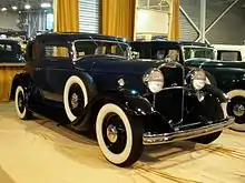 The Lincoln K series was split in 1932 into two lines, the V8 carryover Model KA and the new V12-powered Model KB. The V8 car reverted to a 136 in (3454 mm) wheelbase, though engine output was pushed to 125 hp (93 kW). The KB, on the other hand, featured the marque's new L-head V12 engine. The 447.9 cuin (7.3 L) 65° L-head unit produced 150 hp (112 kW).[4] Both series featured a new grille with less of a surround, vent doors rather than vertical louvers on the sides of the hood, a parking light on top of each front fender, and 18 inch wire wheels. The Lincoln V-12 competed directly with cross town rival Cadillac V-12 introduced earlier in 1930, and it joined a select group of 1930s cars with multicylinder engines, namely those manufactured by Franklin, Hispano-Suiza, Horch, Lagonda, Maybach, Packard, Rolls-Royce, Tatra, Voisin, Walter, and Marmon. The Victoria Coupe was offered as both a steel roof and a convertible, and the coupe was the inspiration for the smaller 1932 Ford Victoria coupe, also offered with a V8 engine but a more affordable price.[5] The Lincoln Victoria coupe, first introduced in limited numbers in 1929,[6] also competed with the Packard Light Eight Victoria coupe also in 1932.