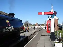Out of the 18 levers, at the present time, only 4 are in use. However a future scheme is currently being worked on that will bring 8 levers into use. All the signals with the exception of the Down Starter (LU3) have SPT's (Signal Post Telephones) fitted to them. These allow both the driver and signalman to contact each other. Ludborough currently operates two Great Northern Railway somersault signals (LU3 down starter and LU14 Up Inner Home). These type of signals were used all over the East Lincolnshire Railway, and is appropriate for the railway's needs.