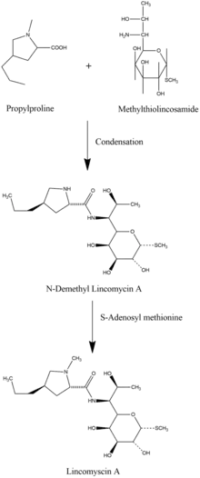 Biosynthesis of lincosamides occurs through a biphasic pathway, in which propylproline and methylthiolincosamide are independently synthesized immediately before condensation of the two precursor molecules. Condensation of the propylproline carboxyl group with the methylthiolincosamide amine group via an amide bond forms N-demethyllincomycin. N-Demethyllincomycin is subsequently methylated via S-adenosyl methionine to produce lincomycin A.[5][6]
