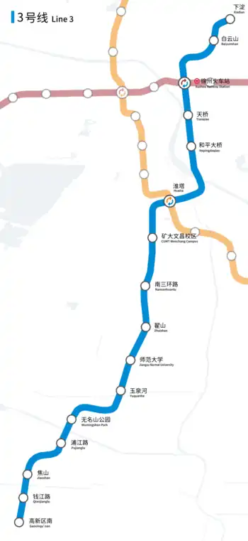 Line 3 of the Xuzhou Metro (Chinese: 徐州地铁3号线) is a rapid transit line in Xuzhou city, Jiangsu province, China. It is the third metro line to open in Xuzhou.