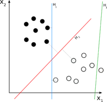 In this case, the solid and empty dots can be correctly classified by any number of linear classifiers. H1 (blue) classifies them correctly, as does H2 (red). H2 could be considered "better" in the sense that it is also furthest from both groups. H3 (green) fails to correctly classify the dots.