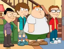 - Schmuley "Snot" Lonstein (voiced by Curtis Armstrong) – Steve's best friend with whom he shares a bromance.[8] Snot is a mustached and acne-covered Jew. He is physically modeled after his voice actor's character's appearance from the movie Revenge of the Nerds, as Dudley "Booger" Dawson. Since Snot was a toddler and throughout much of the series, he had a crush on Hayley; however, in "The Missing Kink", when Hayley finally succumbed to Snot's advances and began to desire him romantically, Snot lost interest in her and deceived her into thinking he was gay, claiming it was the act of pursuing her that aroused him. He speaks Klingon, and can read Quenya. Like Steve, he has a fetish for octogenarian women. His parents are poor, as they could not afford a bar mitzvah celebration, although Steve pays for one in an attempt to apologize when he is falsely accused of theft. His parents have him see a therapist who is implied to engage with him inappropriately and romantically. Steve reveals that his father left Snot's family and may have been abusive towards his mother. He is generally considered Steve's best friend but is quite fickle in this role, having cheated with Steve's girlfriends and pelted him with apples during a period where Steve was in a brace for scoliosis in order to gain social acceptance. When Snot and Steve were younger, they solved mysteries together. He refused to help Steve figure out the mystery, as he quit when "the case of the missing bike horn turned into a double rape homicide". Snot appears to be the least eccentric member of Steve's clique. It is also revealed in the episode "Wiener of our Discontent" that he can somewhat understand Toshi. Toshi exclaims "Oh, my God", and Snot replies "I think you mean 'oh, my Godzilla'."