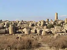 • The Temple of the Olympian Zeus, Agrigento, is termed pseudo-periteral heptastyle, because its encircling colonnade has "pseudo" columns that are attached to the walls of the naos. (Figure 8.) Heptastyle means that it has seven columns across the entrance front.[2]