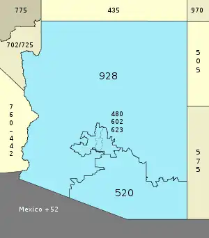 The U.S. state of Arizona is served by five telephone area codes in three numbering plan areas:
