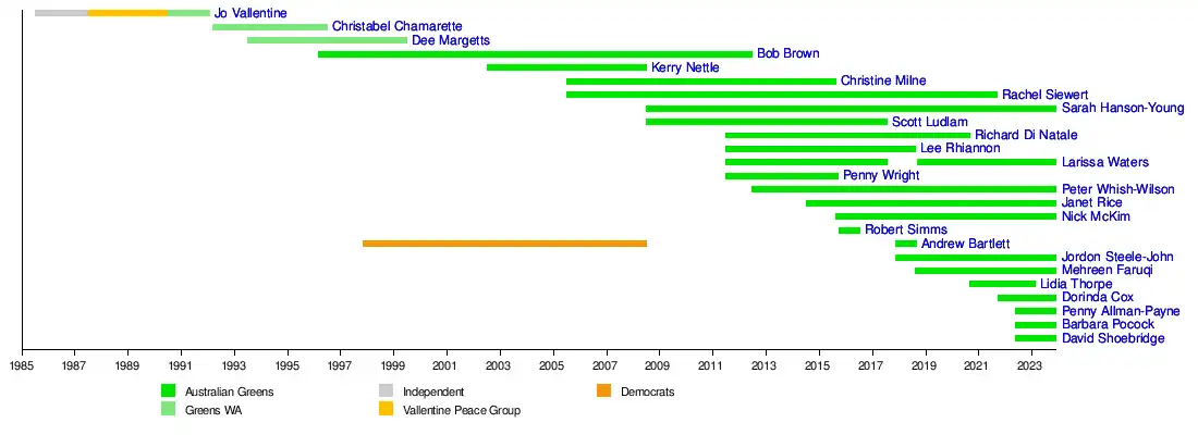 - ↑ Previously sat as an independent senator from 1 July 1985.