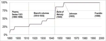 Important publications which are not represented in the table include the 10 poems published (anonymously) during Dickinson's lifetime;[1] and editions of her letters, published from 1894 on, which include some poems within their texts. In all these cases, the poem itself occurs in the list, but these specific publications of the poem are not noted.