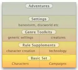 A rough breakdown of GURPS books. Bottom tier are core books necessary to play, moving up to least necessary. Using resources from further up the stack requires less preparation work on the part of the game master.