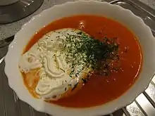 Fliederbeersuppe Dessert Dessert soup made from elderberry, served with semolina dumplings
