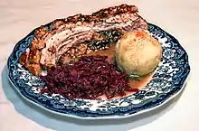 Mecklenburger Rippenbraten Main course Rib roast, made from belly of pork including meat of the upper rib, stuffed with Boskoop apples, prunes, cinnamon, rum and zwieback, usually served with Klöße and red cabbage.