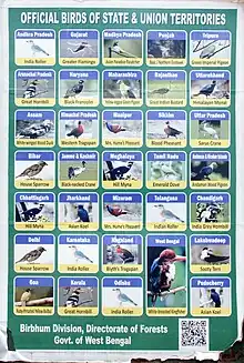 Apart from India's national emblem, each of its states and union territories have their own seals and symbols which include animals, birds, trees, flowers, etc.[1] A list of state birds of India is given below. See Symbols of Indian states and territories for a complete list of all state characters and seals.