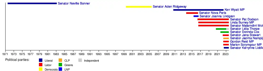 - ↑ Richards, Lisa (15 June 2021). "Indigenous Australian parliamentarians in federal and state/territory parliaments: a quick guide". Parliament of Australia. Archived from the original on 25 November 2021. Retrieved 25 November 2021.