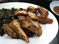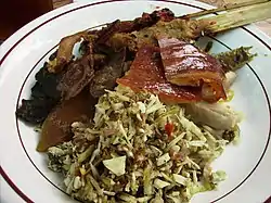 Babi panggang Batak, Balinese, and Indo Roasted pork Pork roasted in light spices and chopped, usually served with Batak style sambal and sayur daun singkong (cassava leaf vegetables).