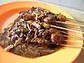 Satay, satai or sate Nationwide Roasted skewered meat, satay Skewered barbecued meat that usually had peanut sauce, or sweet soy sauce. Many type of satay has developed throughout Indonesia. Often eaten with chopped shallots and sambal.