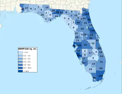 The following are approximate tallies of current listings in Florida on the National Register of Historic Places. These counts are based on entries in the National Register Information Database as of April 20, 2018[2] and new weekly listings posted since then on the National Register of Historic Places website.[3] There are frequent additions to the listings and occasional delistings and the counts here are not official. Also, the counts in this table exclude boundary increase and decrease listings which modify the area covered by an existing property or district and that have a separate National Register reference number.